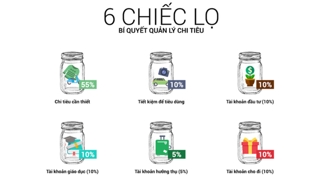 Có nhiều cách quản lý tài chính cá nhân khác nhau và quy tắc 6 chiếc lọ là một trong những quy tắc đơn giản được khá nhiều người áp dụng. Theo quy tắc 6 chiếc lọ, bạn sẽ chia thu nhập mỗi tháng (có thể là tiền lương hoặc bất cứ khoản thu nào khác) thành 6 chiếc lọ tương ứng với số phần trăm khác nhau.